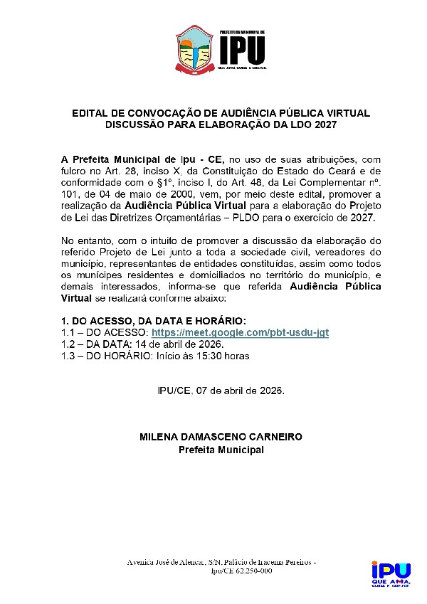 Decreta ponto facultativo o expediente do dia 02/04/2026 para todos os Órgãos da Administração Direta e Indireta do Município de Ipu e dá outras providências.